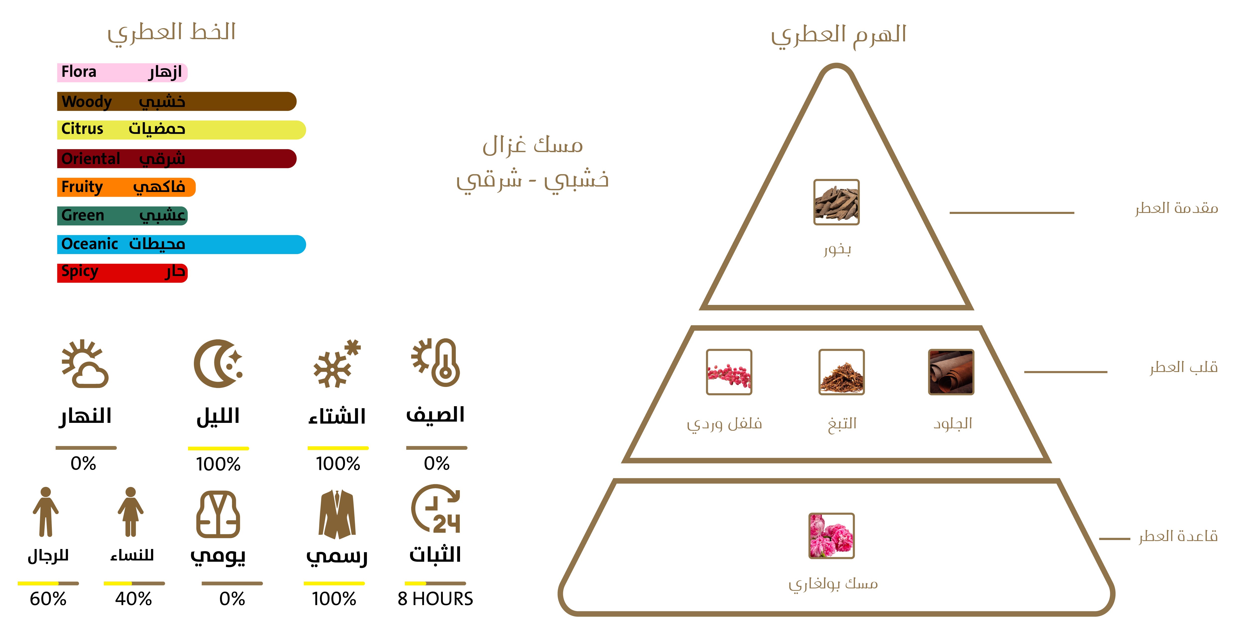 في هذا المزيج، تتوازن نفحات المسك برقّة وتعبيرًا عن الندرة، وكأنك تعيش قصة غريبة من الحياة، لحظات تمنحك إحساسًا بالندرة والتميز، كما لو كنت تشهد عرضًا فريدًا من نوعه.